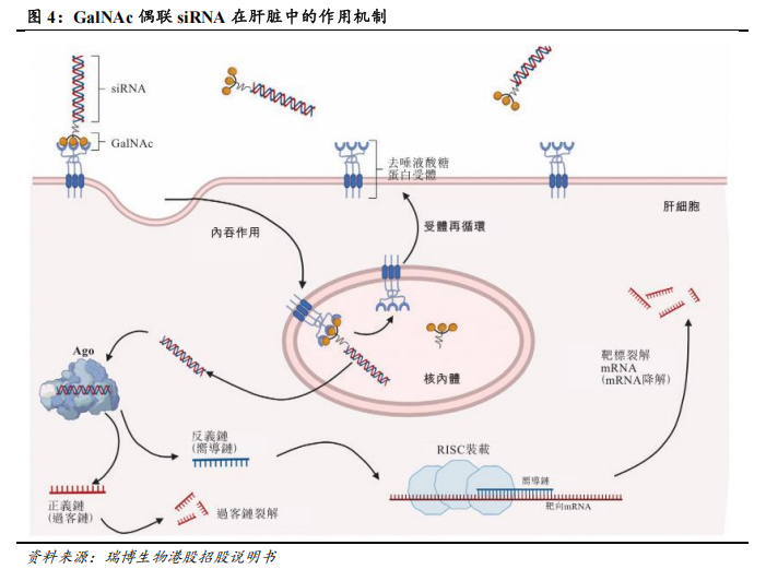 siRNA药物的作用机制。siRNA疗法的生物学机制是荣获诺贝尔奖的RNAi机制,这是一种存在于包括人类和其他哺乳动物在内的广泛生物体中的天然基因调控机制。天然的RNAi过程涉及三个连续步骤:(1)前体RNA通过Dicer酶加工形成短双链RNA分子(20至25个核苷酸)(即微RNA),作为基因沉默的功能单元;(2)然后将这些微RNA分子装载到RNA诱导沉默复合体(RISC)中,在此实现双链解离,仅保留一条链作为引导链;(3)该引导链引导RISC结合靶mRNA,导致mRNA的翻译受到抑制并降解。前述过程称为基因沉默。通过独特的RNAi机制,siRNA疗法可通过精准设计沉默几乎任何基因,为解决过往不可成药靶点提供了重大机遇。此外,siRNA由于其基于序列的靶向机制,与其他模式相比,已经显示出多种优势,包括高特异性和(药效)长久持续,以及令人鼓舞的临床成功率。