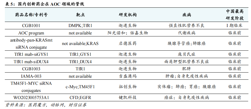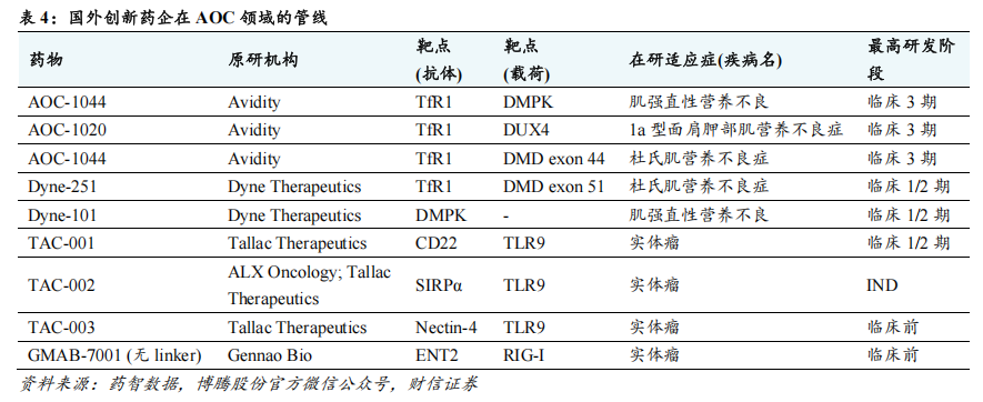 AOC(抗体寡核苷酸偶联物)是将抗体与寡核苷酸通过连接子偶联后形成的复合物,其兼具了抗体的靶向性与寡核苷酸的治疗活性,结构形式上与ADC类似,只是有效载荷从小分子毒素替换成了具有基因调控功能的核酸药物。AOC的作用机制主要为:抗体负责识别并介导靶细胞的特异性内化,确保药物精准定位至目标组织;连接子维持体内稳定并在细胞内触发载荷进行释放,平衡药物循环稳定性与胞内起效效率;而寡核苷酸则通过与靶mRNA特异性互补结合,实现“基因沉默”或“剪接调控”,从根源上干预疾病进程。相较于以GalNAc递送为代表的传统寡核苷酸药物,AOC具备三大核心优势:一是肝外递送能力,通过选择不同的靶向抗体,可实现对肌肉、中枢神经、肿瘤等肝外组织的精准递送,例如针对TfR1靶点的AOC可穿透血脑屏障,为阿尔茨海默病、脊髓性肌萎缩症等中枢神经系统疾病提供新的治疗方案。二是更长的半衰期,抗体分子在血液中具有较强的稳定性,偶联后的AOC半衰期可达数天至数周,远长于传统寡核苷酸药物(通常为数小时至数天),大幅降低了给药频率。三是更低的脱靶毒性,由于AOC仅针对表达特定抗原的靶细胞发挥作用,对正常细胞的影响极小,有效减少了传统寡核苷酸药物可能引发的免疫反应、肝肾功能损伤等脱靶效应。Avidity是AOC领域的龙头公司,其AOC™技术平台专注于解决肌肉疾病治疗中的药物递送难题。Avidity旗下三款核心产品均迈入III期临床阶段(AOC 1020、AOC1044、AOC1001),分别用于治疗面肩肱肌营养不良病、杜氏肌营养不良症以及治疗强直肌营养不良。Avidity 的AOC™技术平台获得多家MCN的认可。2019年4月,礼来与Avidity达成一项全球许可和研究合作,借助Avidity的AOC平台开发免疫学和其他适应症药物,重点探索自身免疫疾病领域;2023年11月,BMS与Avidity达成潜在价值23亿美元的合作,利用Avidity的AOC平台开发最多5个抗体寡核苷酸偶联药物;2025年10月,诺华(Novartis)宣布以120亿美元收购Avidity,诺华将获得Avidity AOC™技术平台及三条后期研发管线。从AOC药物研发进展来看,海外企业处于临床后期阶段,国内企业多处于临床早期。