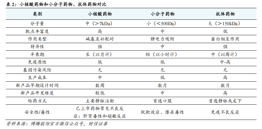 小核酸药物优势明显,有望引领治疗范式升级。小核酸药物基于碱基互补配对原则作用于细胞内的pre-mRNA或mRNA,通过调控蛋白质的表达,从而实现治疗疾病的目的。相比于小分子和抗体药物,小核酸药物具有靶点丰富、特异性强、安全性更高、疗效更久、研发成功率高等优点,有望成为继小分子和抗体之后具有颠覆性的新主流疗法。