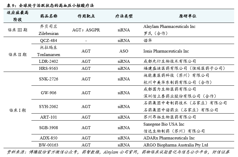 信立泰:2025年5月,信立泰与成都国为生物达成合作协议,获得国为生物在研AGT-siRNA药物GW906在大中华区的独家许可权益。GW906为肝靶向配体偶联siRNA药物,通过特异性沉默肝脏血管紧张素原(AGT)mRNA,抑制肾素-血管紧张素-醛固酮系统(RAAS)最上游前体蛋白的合成,从而阻断血管紧张素II的生成路径,实现长效降压效应。GW906以原发性高血压为靶向适应症,目前正处于临床I期研究阶段。此外,信立泰也积极布局INHBE靶向、用于治疗心血管与代谢疾病的siRNA疗法,目前处于临床前研究阶段。