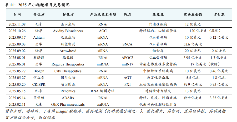 伴随着小核酸技术突破以及相关药物成功上市等,小核酸药物交易活跃度呈现提升趋势,具体表现为:小核酸药物的交易金额、首付款逐年增加,小核酸license-out项目占比不断提高,诞生多笔重磅交易。从重磅交易来看,2019年11月,诺华以97亿美元收购TMC,获得靶向PCSK9的长效siRNA降脂药Inclisiran(Leqvio)。2025年10月,诺华以120亿美元收购AOC(抗体偶联寡核苷酸)领域的龙头企业Avidity Biosciences,获得Avidity的神经学管线和差异化技术平台。从国内企业授权交易来看,舶望制药、圣因生物等企业先后与礼来、诺华等国际大药企达成授权交易,授权合作内容包括在研项目以及技术平台等。2024年1月,诺华以41.65亿美元的总交易金额获得舶望制药多款心血管siRNA药物的海外权益。2025年9月,诺华再次携手舶望制药,就多项心血管靶点siRNA资产展开合作,总交易金额超过53亿美元。2025年11月,礼来与圣因生物达成一项价值最高达12亿美元的合作协议,双方将基于圣因生物专有的LEAD™平台共同推动针对代谢性疾病的RNAi候选药物的开发。LEAD™平台是圣因生物自主研发的一种组织选择性递送技术,能够实现RNAi药物在肝外组织与细胞中的高效、特异性递送。