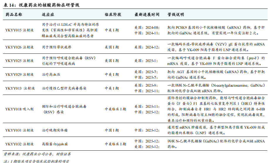 在研管线:公司已有多款siRNA药物和mRNA疫苗进入临床研究阶段,适应症覆盖原发性肝癌、高血脂、高血压、乙型肝炎、带状疱疹、呼吸道合胞病毒(RSV)、实体肿瘤等疾病领域。其中,治疗原发性肝癌的国内首款反义核酸药物——注射用CT102的IIa期临床试验已完成;YKYY015注射液是目前国内处在临床阶段的同类PCSK9 siRNA项目中唯一在美国IND获批的全球潜在Best-in-class超长效siRNA降脂药物;YKYY029注射液是具有全新结构的靶向AGT基因的小干扰核糖核酸(siRNA)药物,已在中国、美国获批开展临床试验;YKYY032注射液是靶向Lp(a)蛋白的双链siRNA药物,已在中国、美国获批开展临床试验。