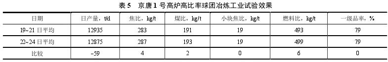 在京唐1号高炉高比率球团工业试验期间,高炉透气性指数变化稳定,风量与压差关系平稳,全风、炉温水平较好,主要技术指标基本稳定,未出现大幅度炉况波动。试验期间平均风量为8419m3/min,与试验前的风量(前3天平均值)8435m3/min基本持平;炉顶煤气温度、压力稳定;炉体冷却水温差下降1℃。实践证实,高比率球团矿冶炼试验取得初步成功,为京唐高炉全面实施高比率球团矿冶炼探索了经验,奠定了实践基础。