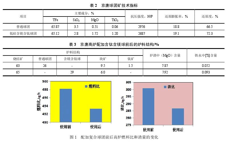 2014年4月份,京唐开始生产含钛球团矿,球团矿平均TiO2含量由0.09%提高到0.7%;2015年,球团矿TiO2含量进一步提高到1.1%,MgO含量保持1.7%,SiO2含量由2.9%降低到2.8%,球团矿还原膨胀率等冶金性能保持良好。表2给出了京唐复合球团矿的技术指标,表3是京唐配加复合球团后的炉料结构,图1显示了京唐高炉采用复合球团矿前后高炉燃料比和渣量的变化。