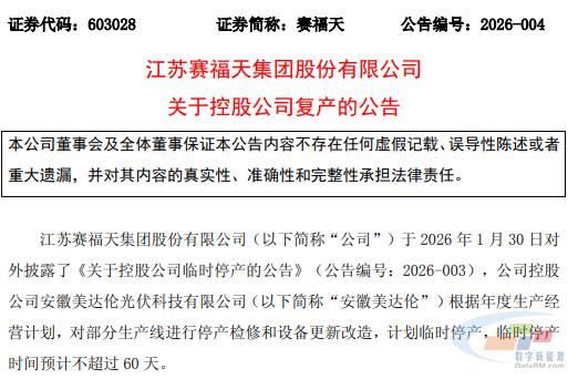 2月26日,赛福天发布公告称,近日其收到控股公司安徽美达伦光伏科技有限公司(以下简称“安徽美达伦”)通知将于近日正式复工复产。