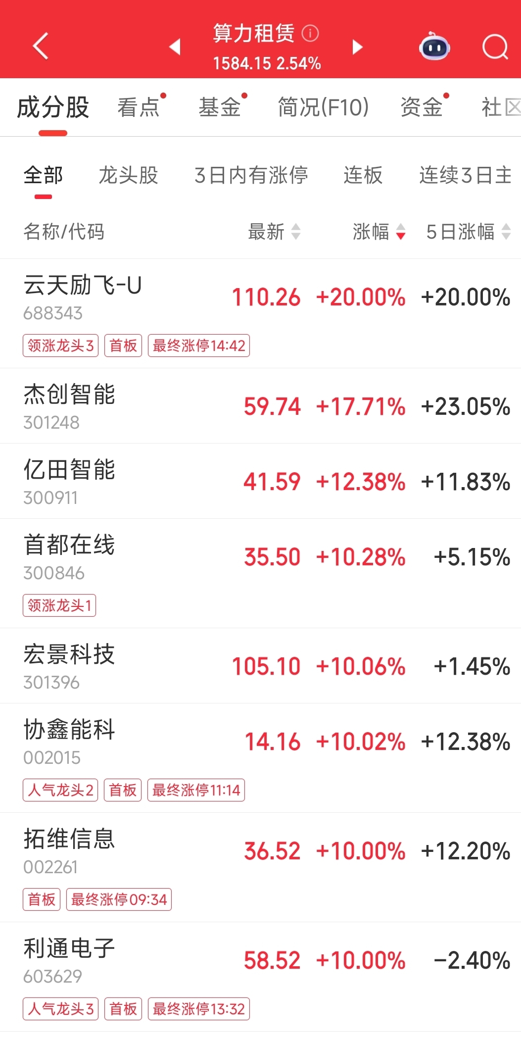 具体来看,A股算力租赁板块,云天励飞-U实现20%的涨停,杰创智能涨幅超过17%,首都在线、宏景科技、亿田智能等均10CM涨停。