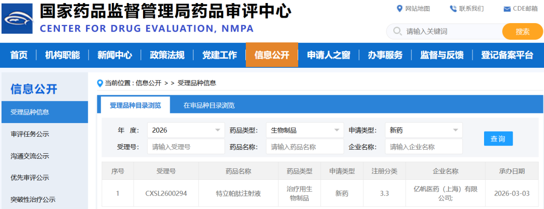 3 月 3 日,CDE “受理品种信息” 栏目更新显示,亿帆医药(上海)有限公司提交的特立帕肽注射液临床试验申请已获承办,药品类型为治疗用生物制品,申请类型为新药。这是亿帆医药在骨质疏松治疗领域布局的重要一步,也标志着国内特立帕肽研发赛道再添新选手。