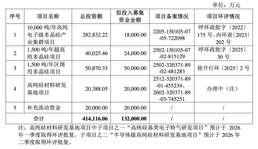 具体包括10000吨/年高纯电子级多晶硅产业集群项目、1500吨/年超高纯多晶硅项目、1500吨/年区熔用多晶硅项目、高纯硅材料研发基地项目,以及补充流动资金。