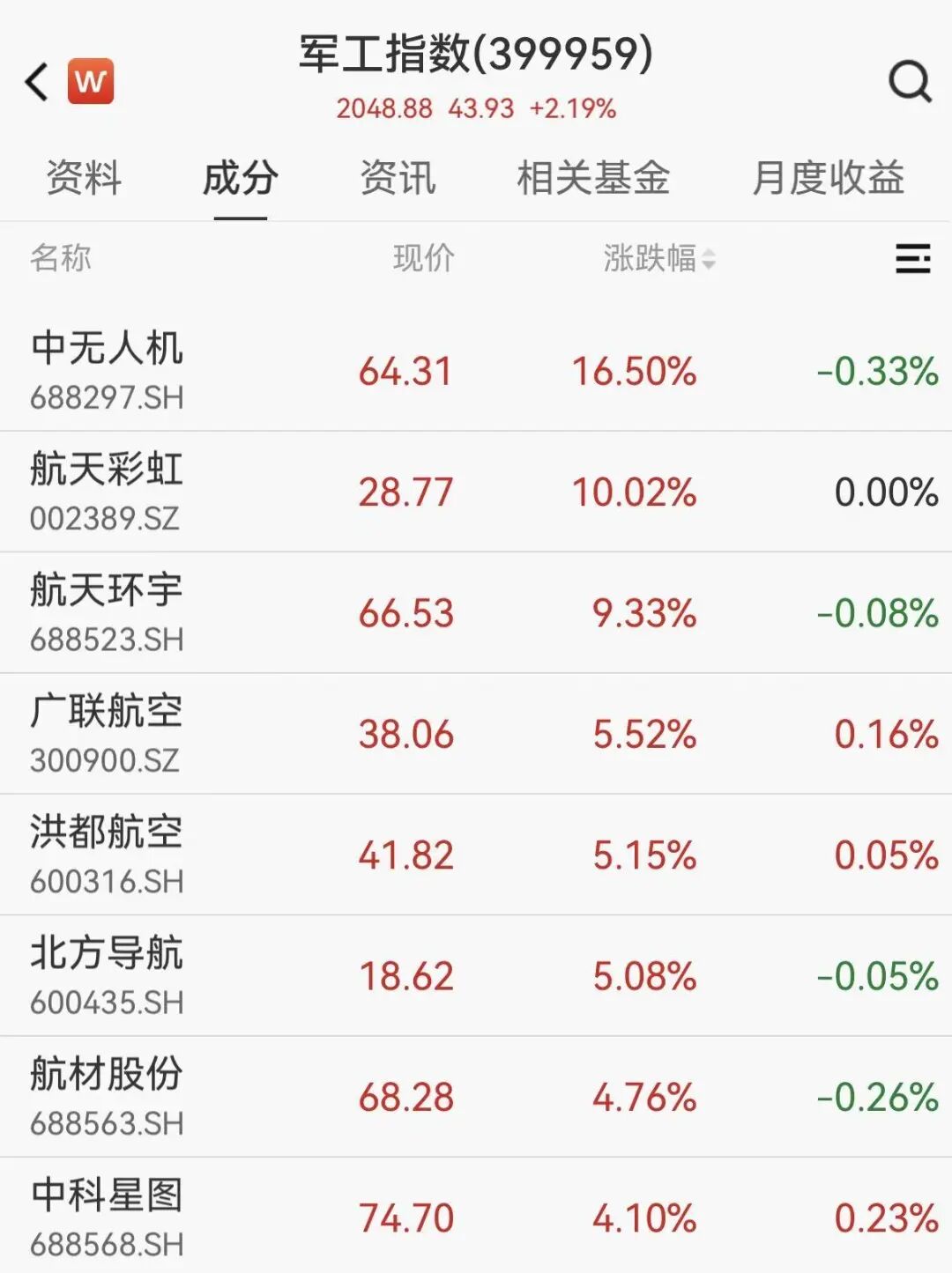 军工板块强势上涨,无人机、船舶方向领涨,航天彩虹3天2板,中无人机涨超16%。