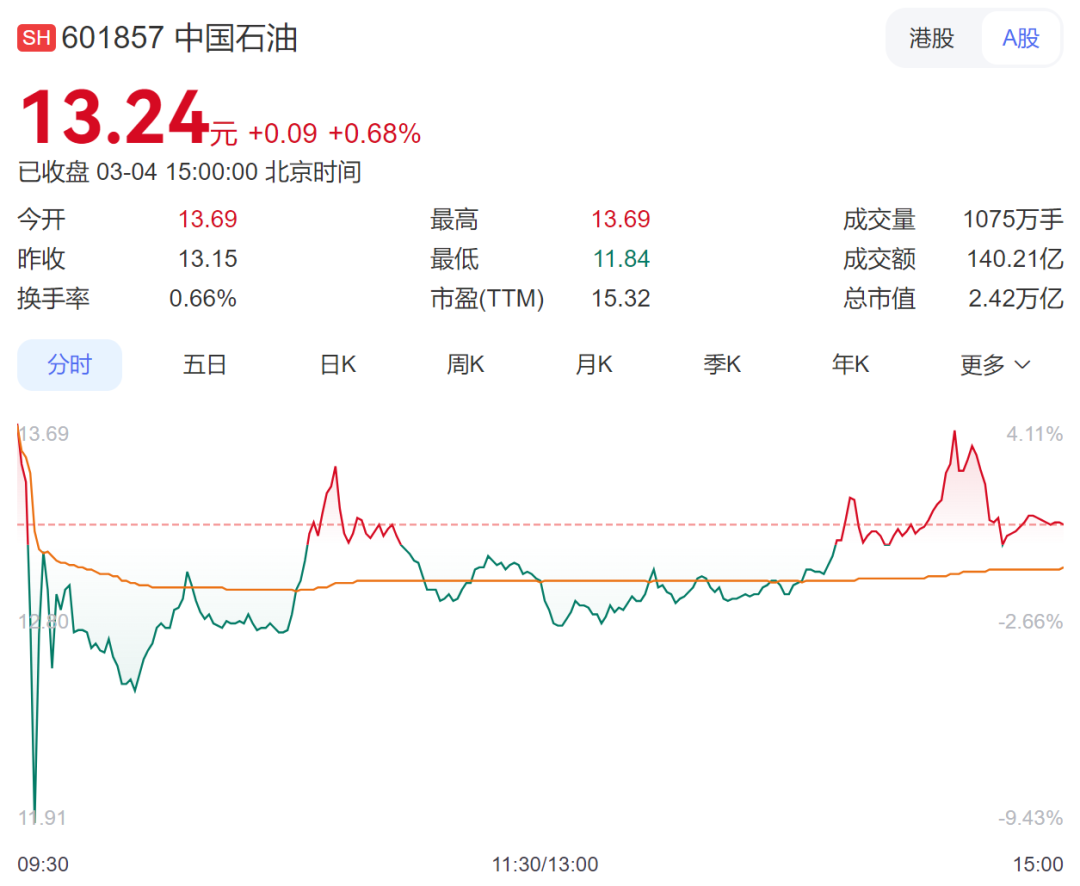 值得注意的是,中国石油最新收盘价13.24元/股,创2009年以来新高,总市值超过建设银行、农业银行,仅次于工商银行,居A股第二位。