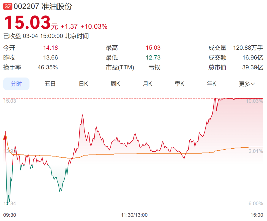 午后油气股探底回升,准油股份3连板,洲际油气7天5板,水发燃气4连板,山东墨龙3连板,洲际油气涨停,通源石油涨超13%,泰山石油、中曼石油、石化油服跟涨。