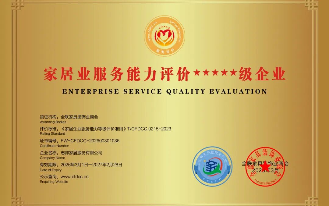 “家居业产品质量评价五星级企业”、“家居业服务能力评价五星级企业”、“家居业信用评价5A级企业”三项专业认证,以全满级的优异成绩,彰显产品品质、服务能力与信用建设领域的综合实力。作为全国工商联基层组织,CFDCC是经国务院批准、民政部登记注册的国家一级商会,其发布的行业评价结果具备高度的专业性与权威性。