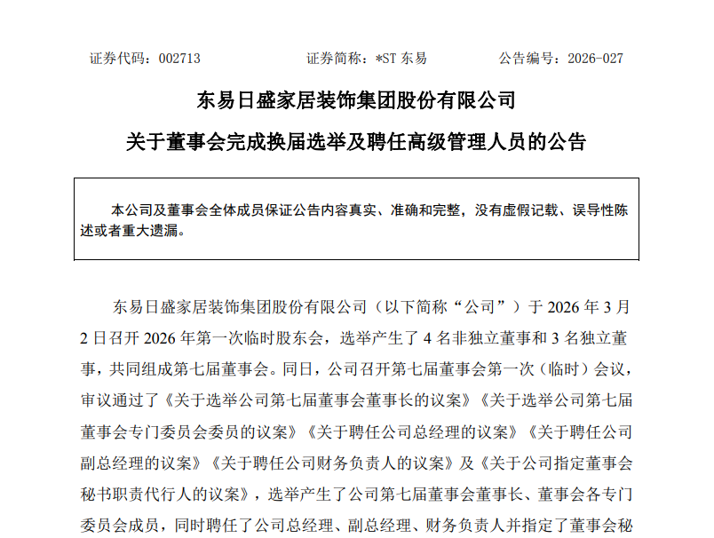 3月3日,*ST东易(002713.SZ)发布公告,公司已完成董事会及高级管理人员换届工作。
