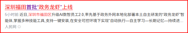 国内落地:深圳福田上线 “政务龙虾”,自动进行政务业务处理;企业端的飞书与企业微信已接入应用。