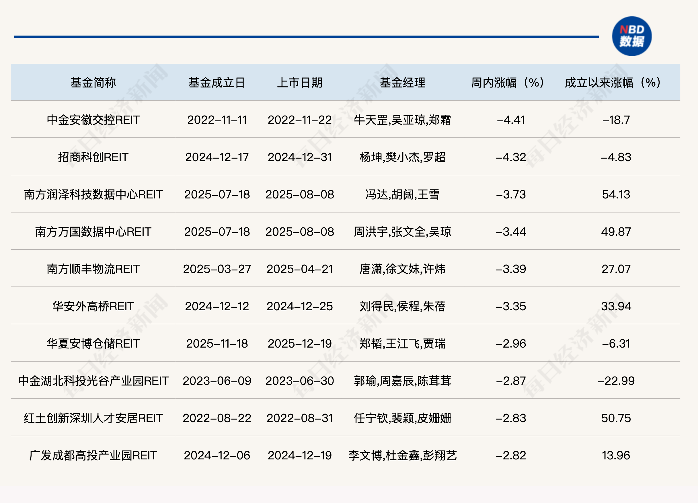 环比下跌的则达到59只,还有2只持平。跌幅最大的三只产品为中金安徽交控REIT、招商科创REIT和南方润泽科技数据中心REIT,周内分别下跌了4.41%、4.32%和3.73%。