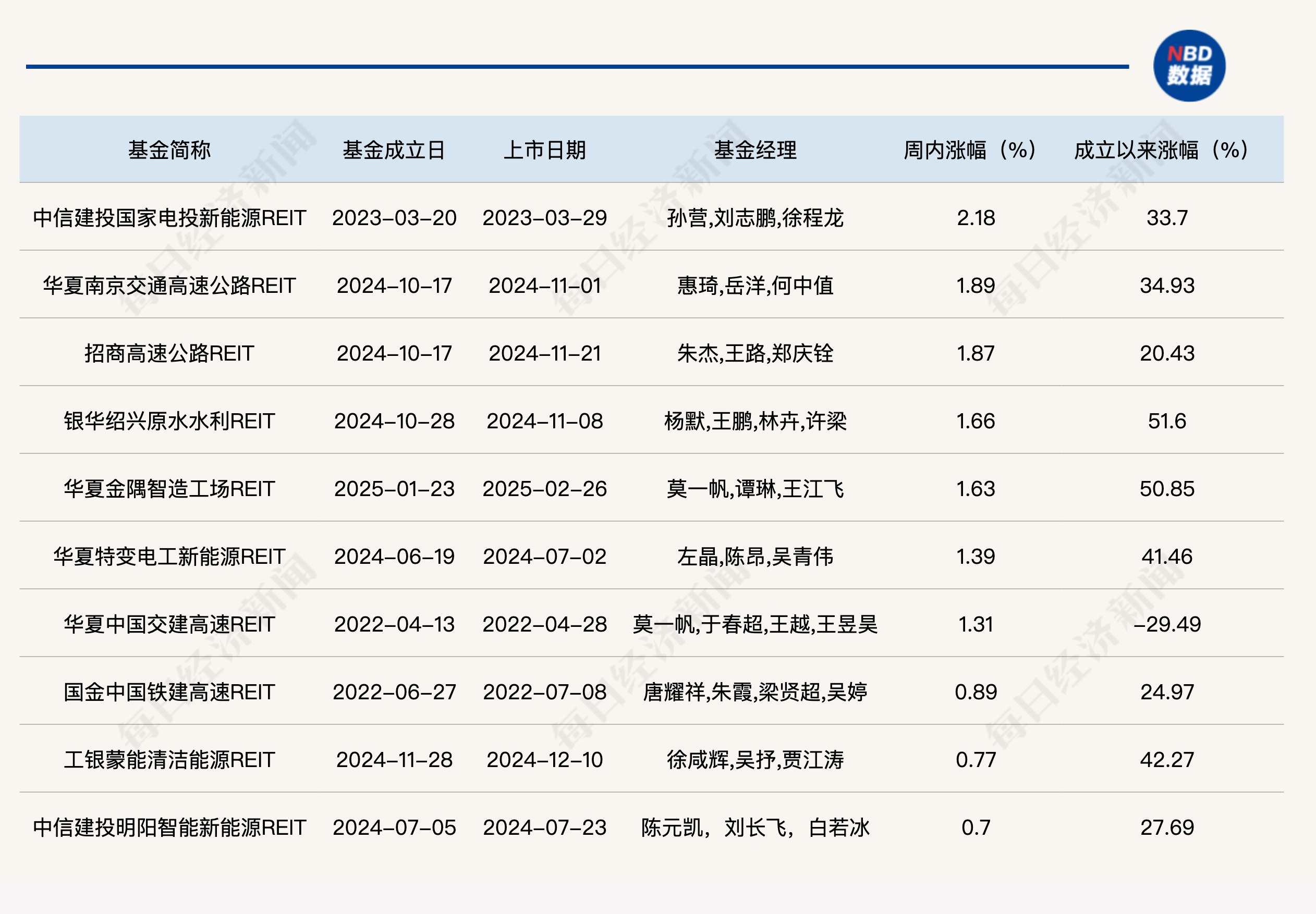 单只产品方面,已上市的79只公募REITs产品中,环比上涨的为18只。涨幅最大的三只产品为中信建投国家电投新能源REIT、华夏南京交通高速公路REIT和招商高速公路REIT,周内分别上涨2.18%、1.89%和1.87%。