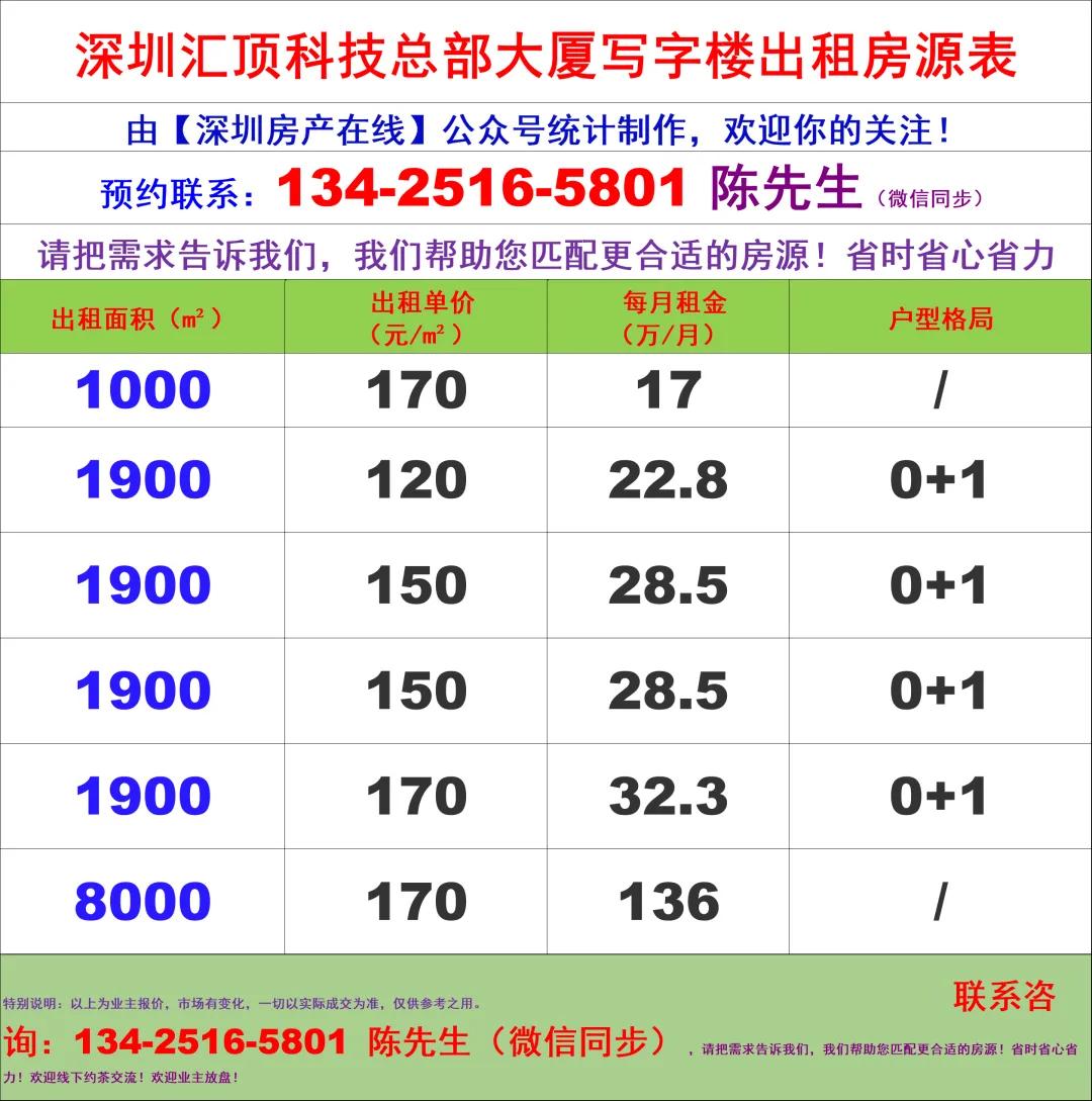 📊汇顶科技总部大厦写字楼办公室出租房源表