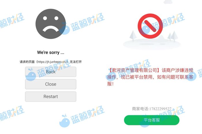 记者实测受访对象提供的君河资产下载二维码,链接页面显示“‘君河资产管理有限公司’该商户涉嫌违规操作,现已被平台禁用,如有问题可联系客服!”