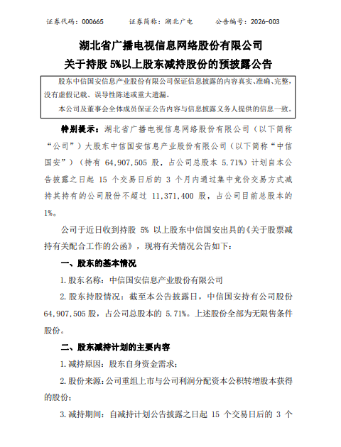 3月12日,湖北广电(000665.SZ)发布公告称,披露持股5%以上股东中信国安信息产业股份有限公司(以下简称“中信国安”)的减持计划。