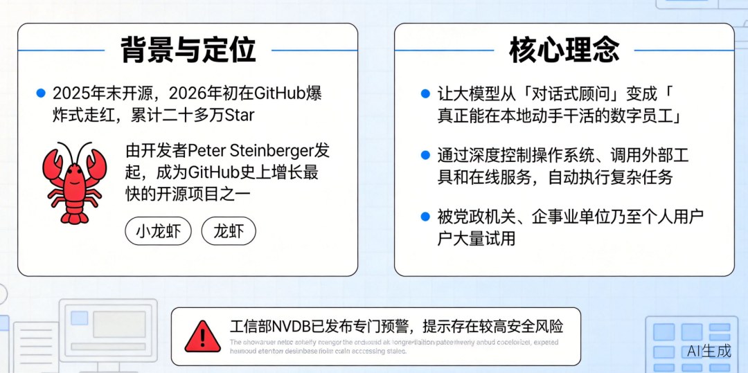 OpenClaw因图标是红色龙虾,被广泛昵称为“龙虾”或“小龙虾”,同时受到产业界和广大用户广泛关注并积极实践应用,引发关于“养龙虾是否安全”的广泛讨论。工业和信息化部网络安全威胁和漏洞信息共享平台(NVDB)已发布专门预警,提示OpenClaw在不安全部署方式下存在较高安全风险,容易引发网络攻击和信息泄露。