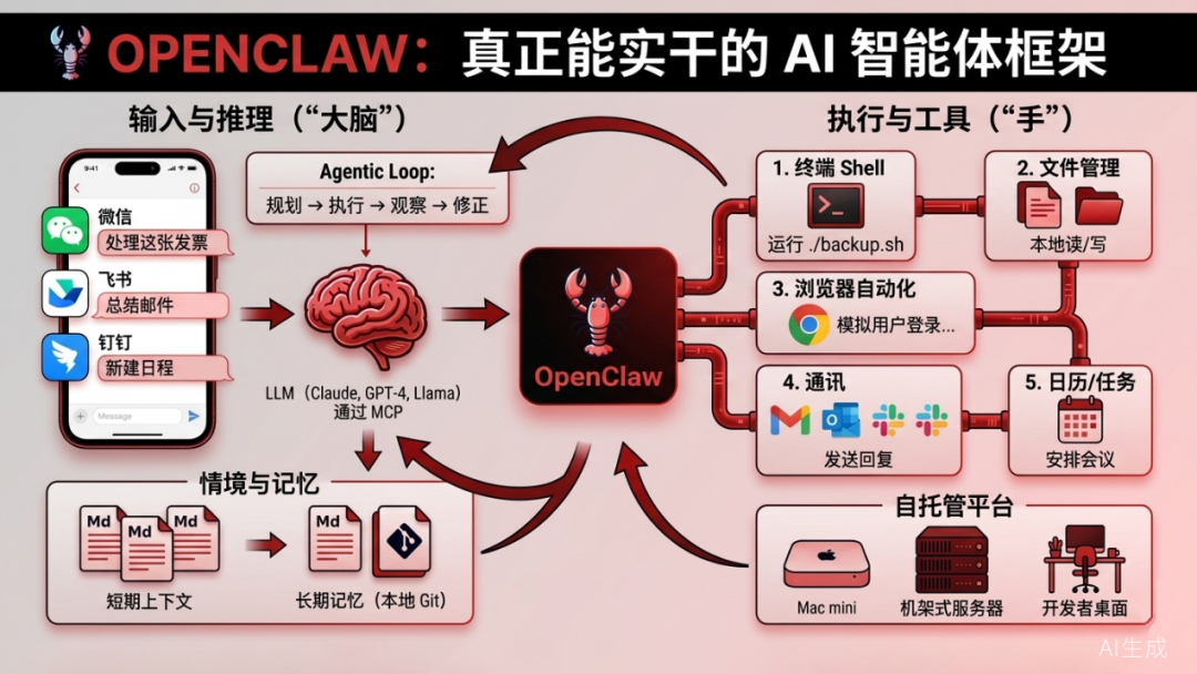 整体来看,OpenClaw以“本地常驻、模块化扩展、闭环执行”为核心特征,从消息接入、决策规划、工具执行到记忆沉淀形成完整链路。各模块分工明确、协同运转,使其区别于传统对话式AI,成为能够长期运行、自主完成复杂任务的通用Agent基础设施。