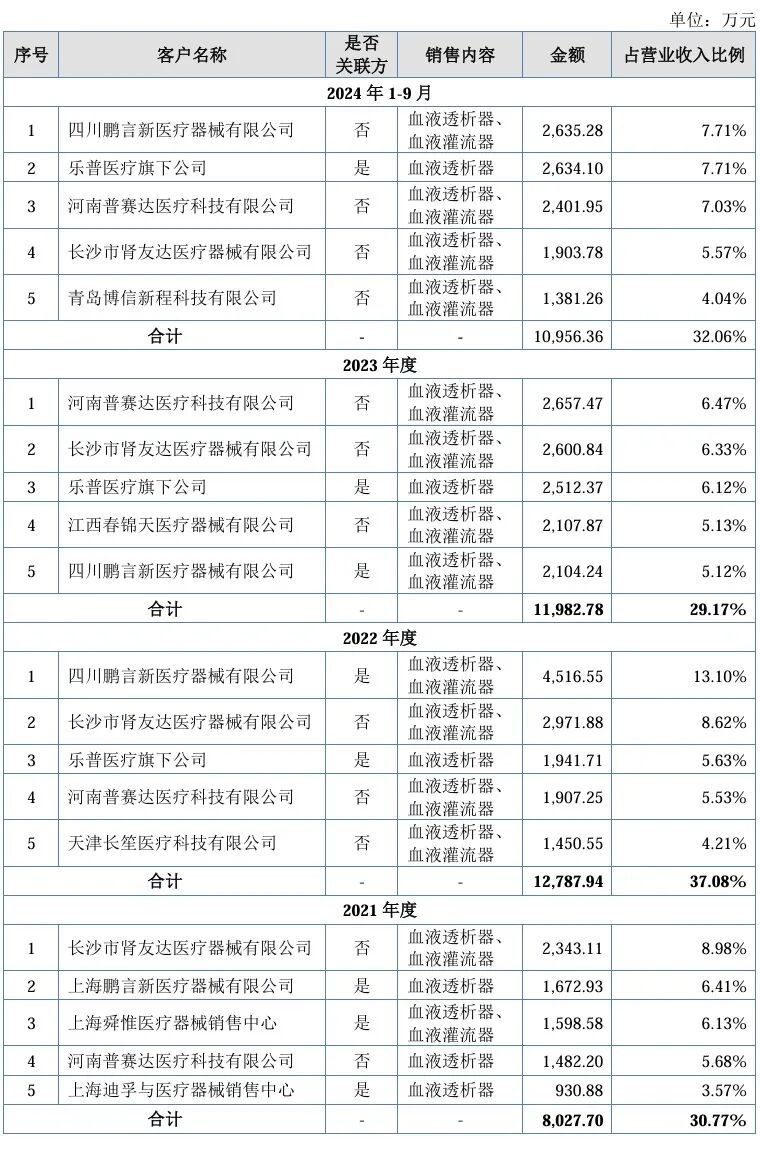 报告期各期,公司向关联方销售商品金额分别为5,224.66万元、7,025.87万元、5,324.87万元和2,634.10万元,主要系向关联方销售血液透析器、血液灌流器产品,占当期营业收入比例分别为20.03%、20.37%、12.97%和7.71%。
