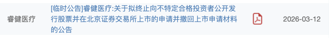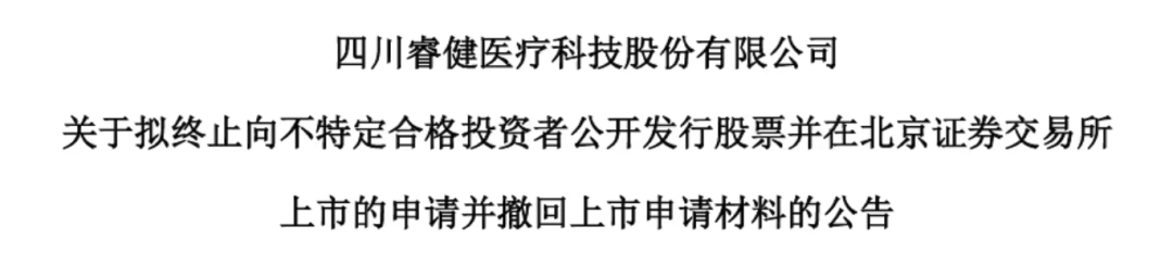 近日,北交所IPO企业四川睿健医疗科技股份有限公司(简称:睿健医疗)发布《关于拟终止向不特定合格投资者公开发行股票并在北京证券交易所上市的申请并撤回上市申请材料的公告》。