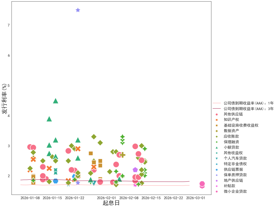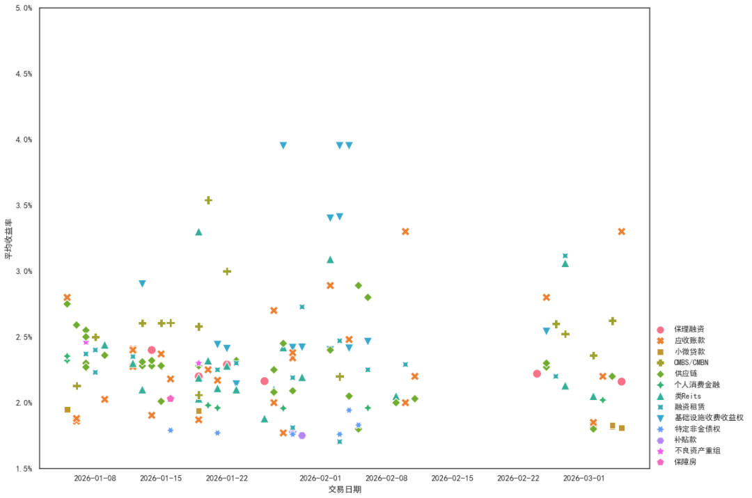 年初泛消金基石投资者阶段性退出,需求收缩对短端发行收益率形成一定上行压力。以1年期AAA档为例,2026年1-2月发行收益率相较2025年11-12月普遍上行。(1)一梯队系列资产:今年初在1.8-1.85%,较前期1.75-1.85%上行5-10bp。(2)二梯队系列资产:发行收益率1.85-1.93%,较前期1.77-1.85%上行8-16bp。(3)三梯队系列资产:发行收益率2.55-2.7%,较前期2.35-2.45%上行10-35bp。低等级档发行收益率变化不大,一梯队资产2026年初在2.1-4%,二三梯队资产在3.5-4.5%。