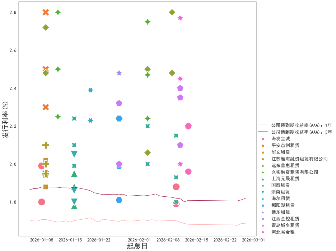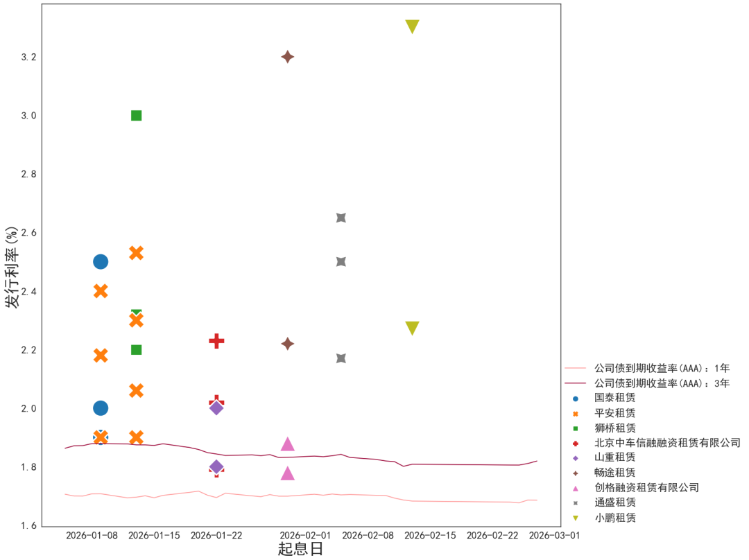 一般租赁主流系列长期限档发行收益率下降。海发宝诚系列发行收益率1.79-1.99%,长期限档利差压缩10bp。平安点创租赁1.95-2.8%,长期限档利差压缩10bp。远东普惠租赁2.48-2.8%,远东租赁小微系列在2-2.5%。
