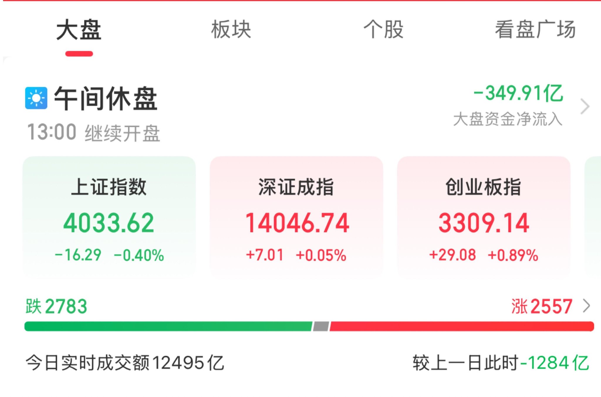 A股三大指数早盘涨跌不一,截至午盘,沪指跌0.4%,深成指涨0.05%,创业板指涨0.89%,北证50指数跌0.03%,沪深京三市半日成交额12495亿元,较上日缩量1284亿元。全市场超2500只个股上涨。