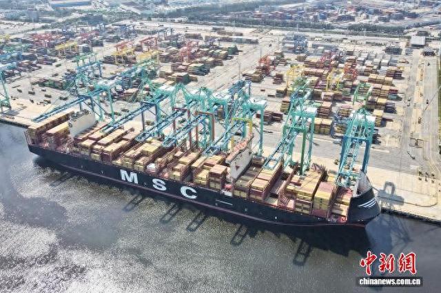 2025年9月,全球首个“智慧零碳”码头——天津港第二集装箱码头高效完成大型集装箱船“地中海阿林娜”号23534标准箱装卸作业,刷新天津港集装箱船舶单航次作业量历史纪录。(无人机照片)记者 佟郁 摄