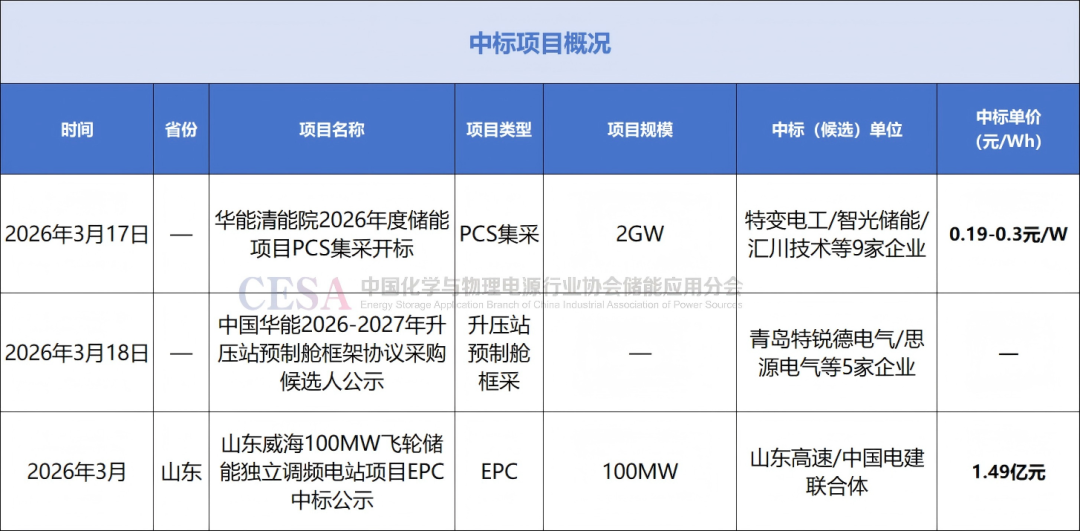 3月17日,华能清能院2026年度储能项目储能交流侧(变流升压)物料及集成代加工框架协议采购中标结果公示。