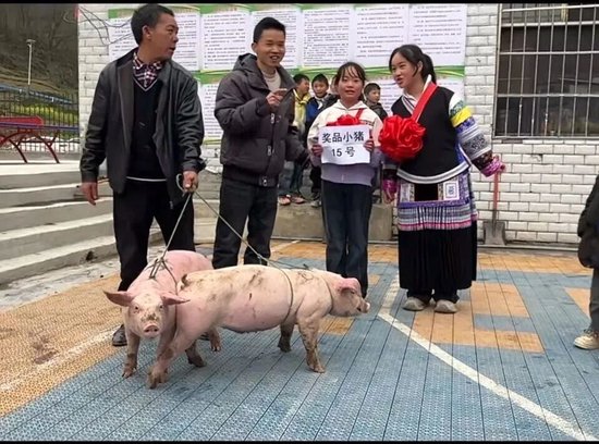 学校一共200多人,侯长亮参考学习成绩和家庭条件选了24名孩子发放小猪,“轻的四十斤,重的有六七十斤”,由家长牵着绳或扛着麻袋带回家,场面非常热闹。