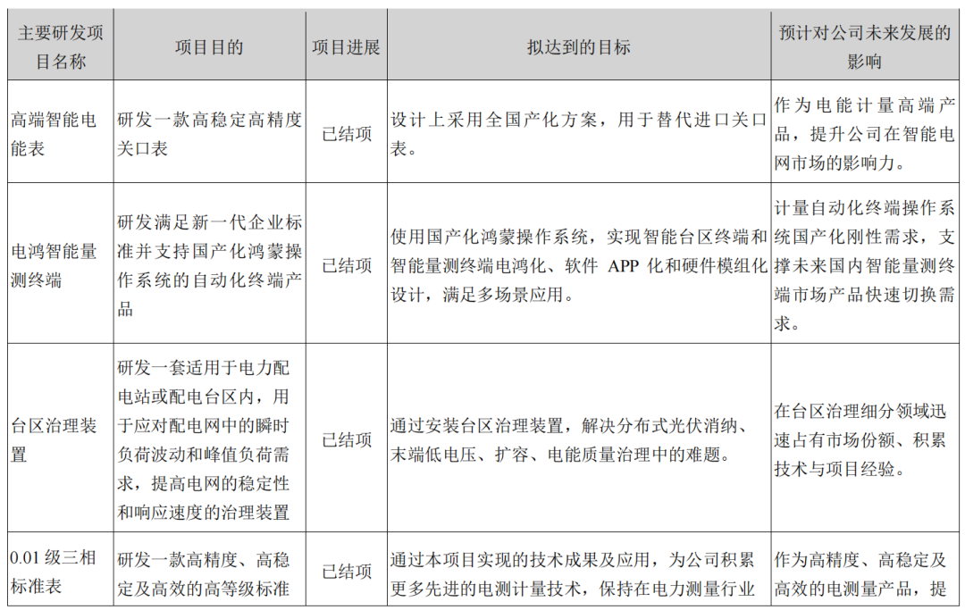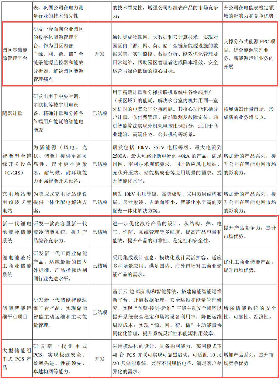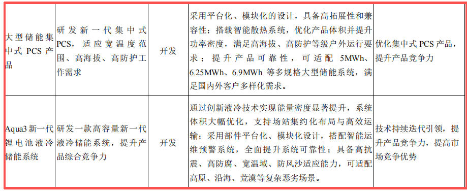 主要研发项目包括园区零碳能源管理平台、新一代锂电池液冷储能系统、锂电池液冷工商业储能系统、大型储能组串式/集中式PCS产品、Aqua3新一代锂电池液冷储能系统、储能智能运维平台项目等。