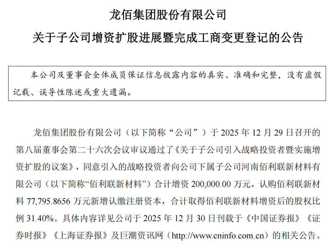 根据其公告披露的信息,龙佰集团于2025年12月29日召开的第八届董事会第二十六次会议审议通过了两项关键议案:一是下属子公司河南佰利联新材料有限公司(以下简称“佰利联新材料”)引入战略投资者实施增资扩股;二是出售所持佰利联融资租赁(广州)有限公司(以下简称“融资租赁公司”)的全部股权。截至2026年3月18日,上述两项交易均已完成交割与工商变更。