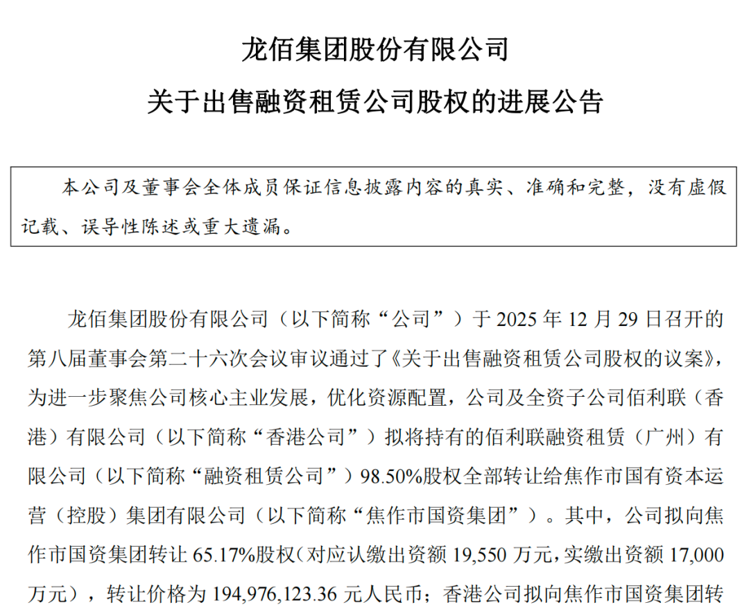 与此同时,龙佰集团在非核心业务上果断做出了“减法”。3月18日的公告显示,龙佰集团及全资子公司佰利联(香港)有限公司已将其持有的融资租赁公司98.50%股权全部转让给焦作市国有资本运营(控股)集团有限公司,交易总额约3.15亿元。其中,龙佰集团转让的65.17%股权作价1.95亿元,香港子公司转让的33.33%股权作价1.15亿元。随着标的公司更名为“中焦融资租赁(广州)有限公司”并完成过户,龙佰集团正式剥离了金融租赁业务。