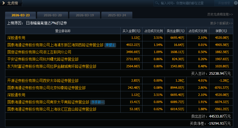 东方新能(维权)(002310)今日涨停,成交额31.95亿元,换手率20.29%,盘后龙虎榜数据显示,深股通专用席位买入1.12亿元并卖出6695.40万元。开源证券股份有限公司西安太华路证券营业部净卖出1.28亿元。