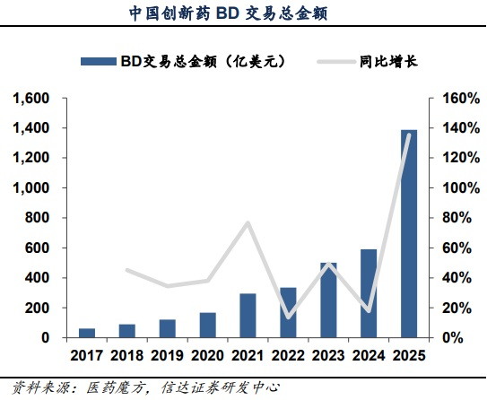 根据医药魔方统计,2025年国内创新药融资金额146.84亿美元,同比增长约127%,国内创新药融资已经实现触底回升;2025年中国创新药BD交易总金额1388亿美元,其中BD交易