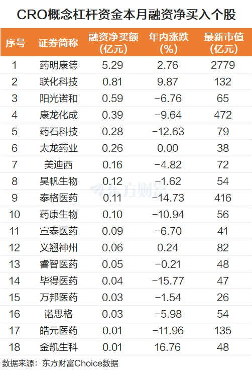 个股角度而言,本月以来不少CRO概念被杠杆资金积极抢筹。药明康德被融资净买入5.29亿元;联化科技、阳光诺和被融资净买入超5000万元;康龙化成、药石科技、太龙药业也被融资净买入居前。