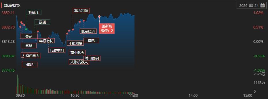 盘面上,国家数据局再提绿色电力支撑作用,绿色电力板块表现活跃,韶能股份(000601)、拓日新能(002218)、金开新能(600821)等10余股涨停。CRO龙头药明康德(603259)公布业绩后走高并带动板块上扬,其股价涨超5%,美诺华(603538)、百奥赛图收获涨停。港口航运板块盘中拉升,招商南油(601975)封板,中远海能(600026)、招商轮船(601872)涨幅居前。此外,军工、有色金属、体育产业等板块均有所反弹。另一方面,美伊局势反复搅动市场,石油天然气板块跟随国际油价下跌,洲际油气(600759)、通源石油(300164)、准油股份(002207)多股回调。光伏设备板块受资金了结影响多数调整,迈为股份(300751)、钧达股份(002865)、奥特维纷纷下挫。