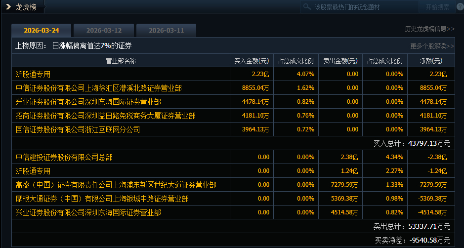 节能风电(601016)今日涨停,成交额54.77亿元,换手率19.49%,盘后龙虎榜数据显示,沪股通专用席位买入2.23亿元并卖出1.24亿元。中信建投(601066)总部净卖出2.38亿元。