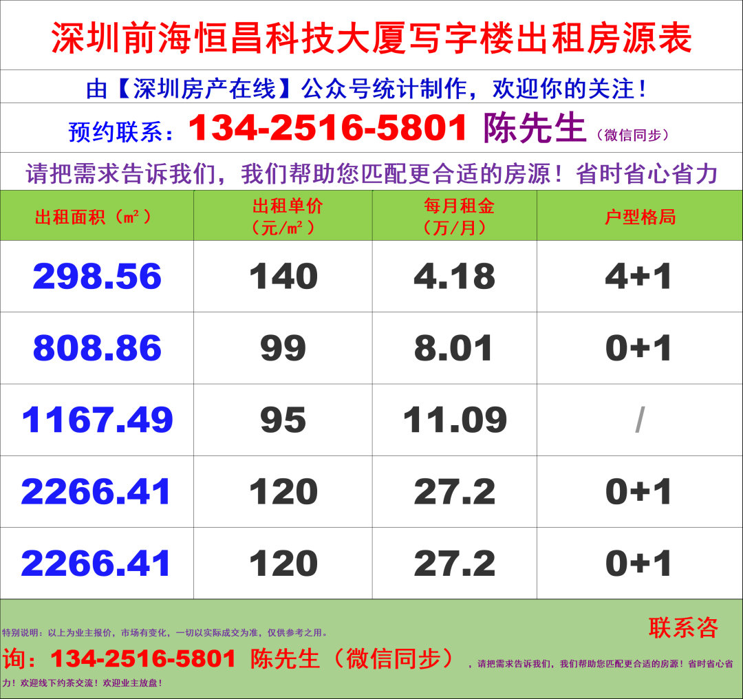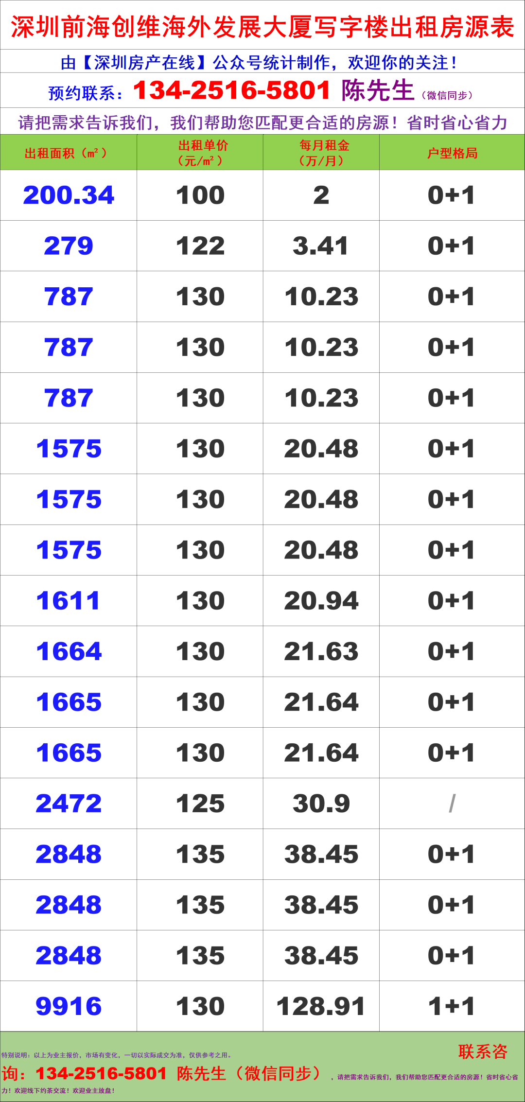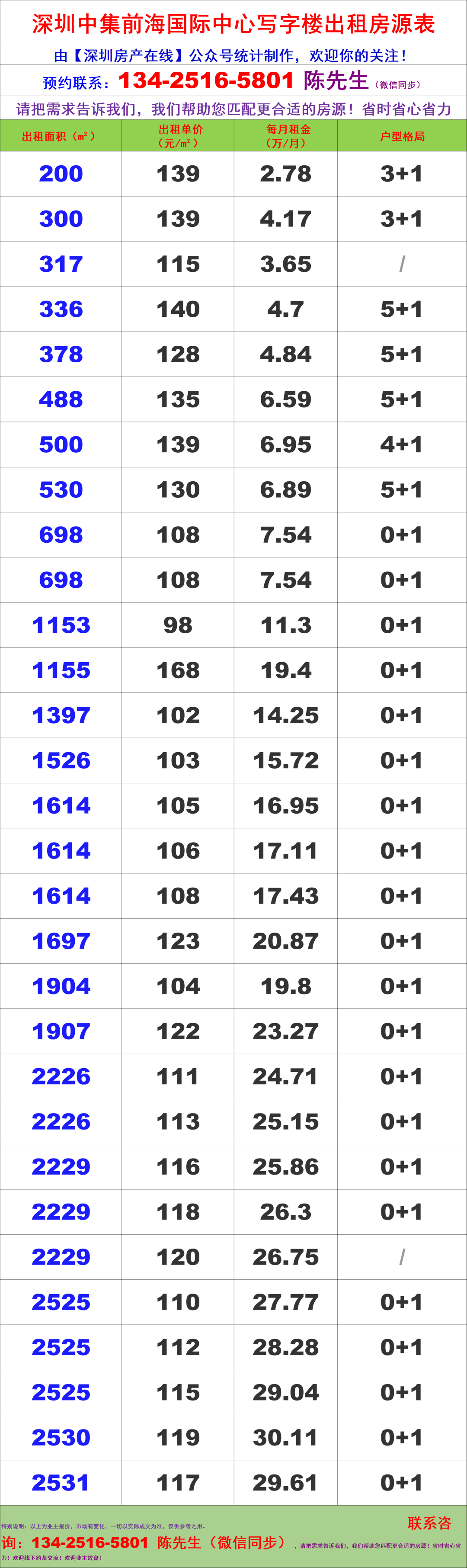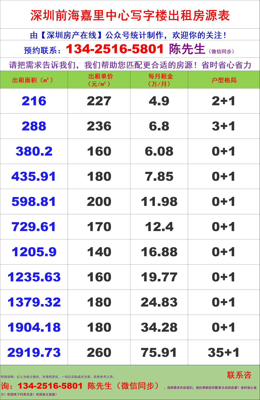 如果您对前海前湾片区的写字楼租赁、企业选址有任何需求,欢迎随时联系【深圳房产在线】陈经理团队:134-2516-5801(微信同步),我们将为您提供最专业的服务!