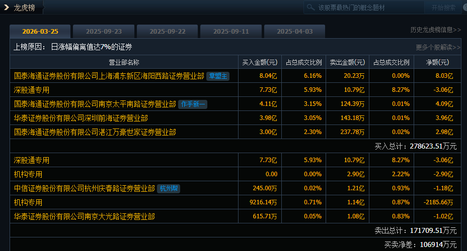 立讯精密(002475)今日涨停,成交额130.44亿元,换手率3.59%,盘后龙虎榜数据显示,深股通专用席位买入7.73亿元并卖出10.79亿元,有2家机构专用席位净卖出3.11亿元。国泰海通上海浦东新区海阳西路(章盟主)净买入8.03亿元。