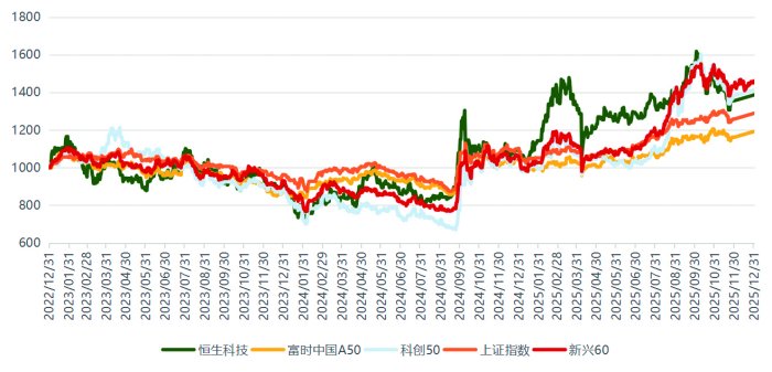 新兴60指数以2022年末为基日,回溯计算,指数2019年初至2025年末测算累计收益率为193.8%,远高于同期主要A股指数(上证指数为59.1%、沪深300指数为53.8%、深证成指为86.8%、富时A50指数为47.4%、MSCIA50指数为76.5%)。按产业分,新型装备、先进制造和新经济业态分别累计上涨5.7倍、5.5倍和5.2倍,其他产业均实现2倍以上涨幅。