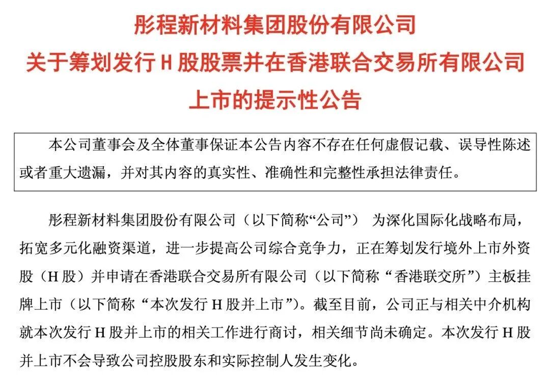 2月8日,已在上海证券交易所上市的彤程新材料集团股份有限公司,正式向港交所递交主板上市申请,寻求实现A+H两地双重上市,本次发行的独家保荐人为国泰海通。