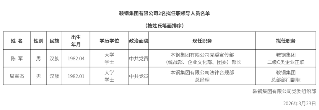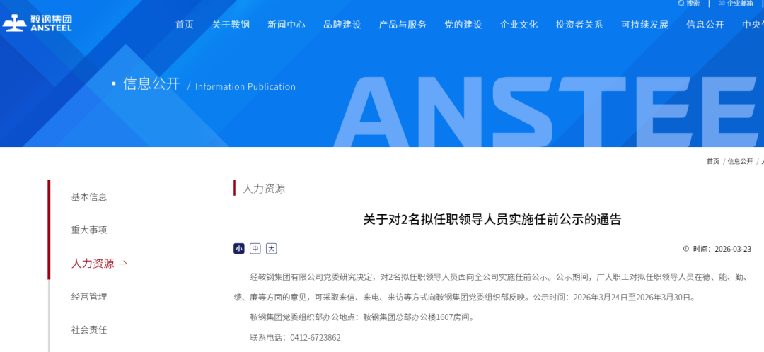 2026年3月23日,鞍钢集团官网发布通告,经鞍钢集团有限公司党委研究决定,对2名拟任职领导人员面向全公司实施任前公示。