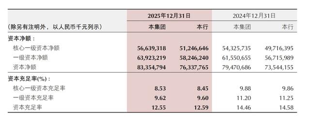 资本充足率的持续走低,则成为制约该行规模持续扩张的核心瓶颈。2025年末,该行核心一级资本充足率、一级资本充足率、资本充足率分别为8.53%、9.62%、12.55%,较上年末分别下降1.35、1.58、1.91个百分点,尽管仍满足监管要求,但下降幅度较为明显。