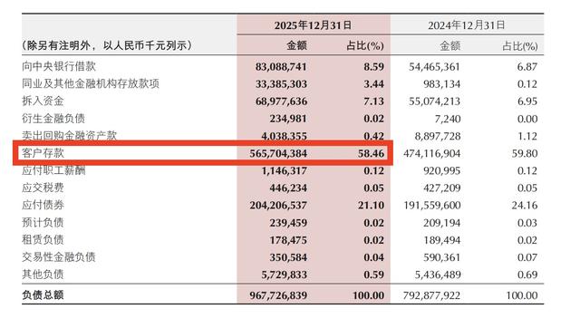 数据显示,2025年该行生息资产平均收益率较上年下降27个基点至3.53%,但计息负债平均成本率下降幅度更大,同比下降40个基点至2.18%。负债端的改善,一方面来自存款结构的优化,截至2025年末,该行客户存款总额5657.04亿元,同比增长19.32%,其中个人定期存款同比增长24.12%至2803.67亿元,储蓄存款占存款总额比例升至54.22%,低成本稳定存款占比提升有效拉低了负债成本;另一方面,该行主动调整负债结构,同业负债等市场化负债占比合理控制,进一步降低了综合负债成本。
