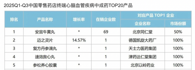 在公立医疗机构和零售终端两大核心市场,头部企业竞争优势显著。天士力旗下复方丹参滴丸、达仁堂速效救心丸、上海和黄药业麝香保心丸、步长制药脑心通胶囊等独家品种,常年稳居销量前列,单个大单品年销售额可达数十亿元。2025年前三季度,天士力的独家品种复方丹参滴丸与达仁堂速效救心丸均跻身零售终端前五位置。