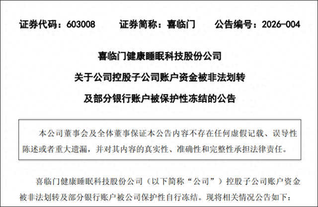 喜临门公告显示,近日,公司发现下属控股子公司喜途科技有限公司的银行账户资金被非法划转,划转资金累计1亿元,该账户系喜途科技开设在工商银行杭州分行的一般户。经公司核查,发现相关人员涉嫌利用职务之便,非法挪用公司资金。